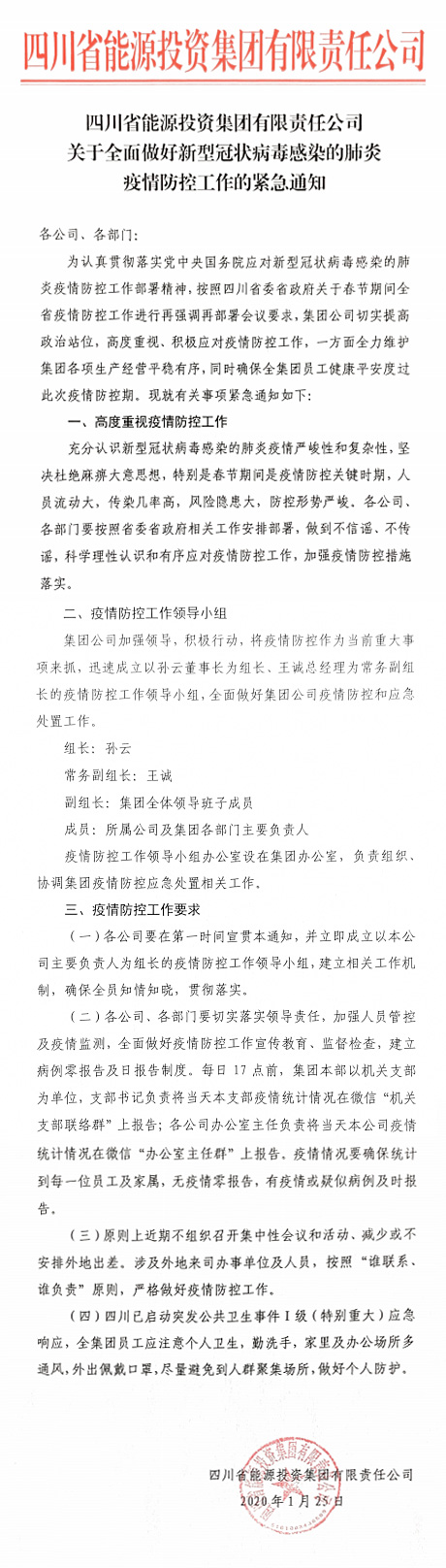 四川能投关于全面做好新型冠状病毒感染的肺炎疫情防控工作的紧急通知